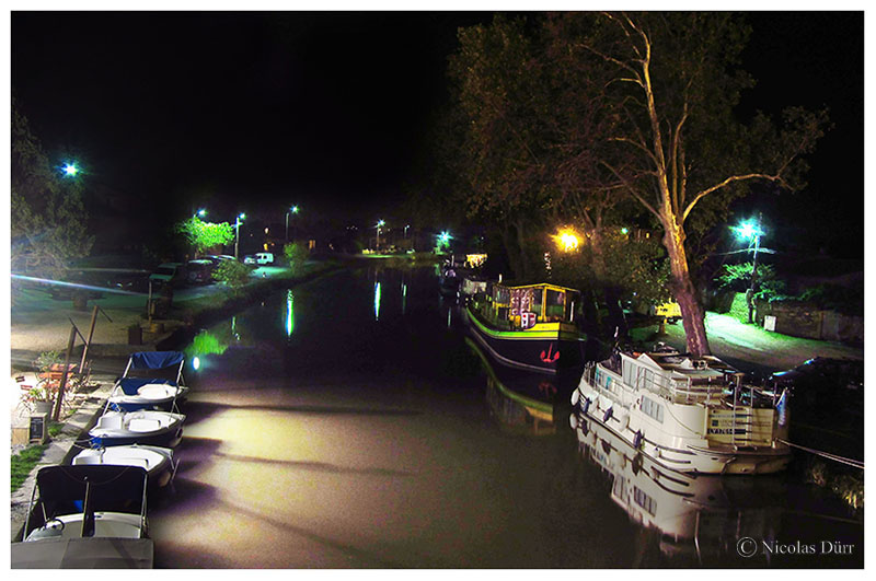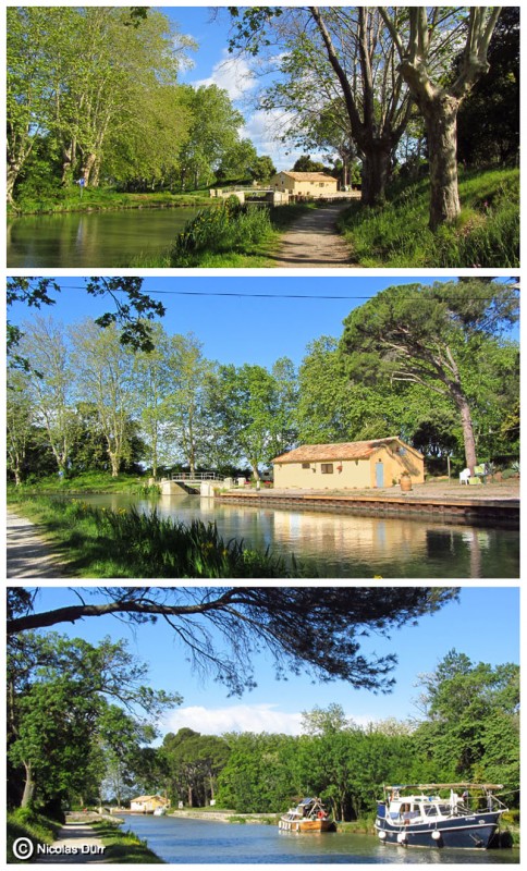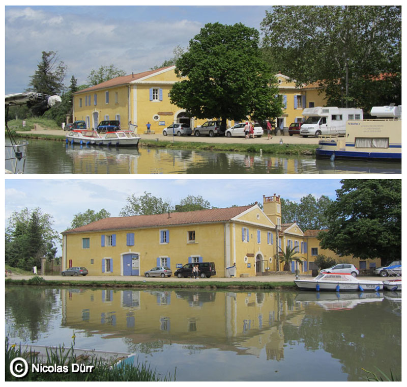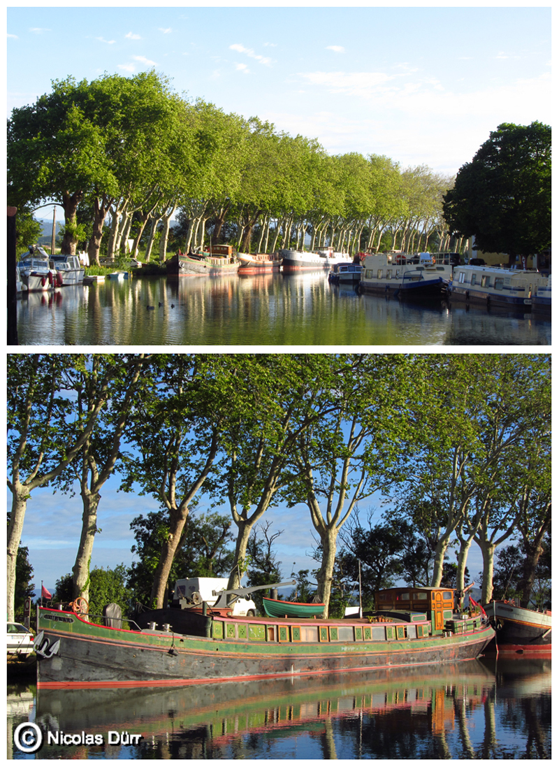 Ayant eu pour objectif de revenir sur ce hameau par 2 fois, 1 an après, j’aurai l’occasion de photographier deux emblèmes flottants en escale : la péniche « Béatrice », sur la photo ci dessous en haut à gauche, itinérante parfois mais souvent stationnée à Port-Cassafières dans l’Hérault (entre Béziers et Agde), et la péniche de luxe « Alégria », itinérante entre Carcassonne et Béziers, offrant des prestations haut de gamme.
