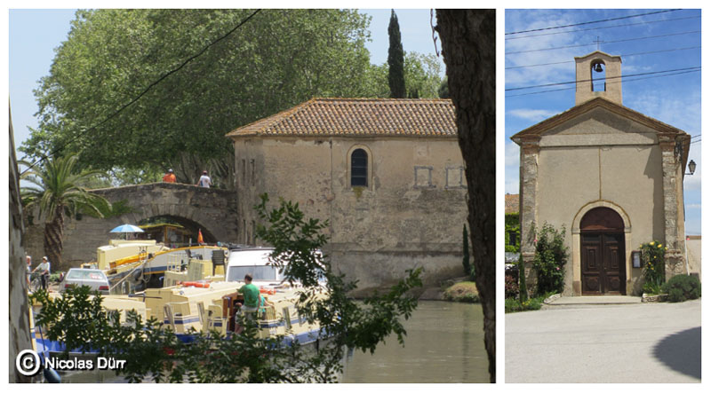 Ci dessous, photo du bas, à gauche, un gîte qui hébergeait et proposait le souper autrefois aux voyageurs de la 3ème couchée de la barque de poste en provenance de Toulouse, au centre, le pont (1683) délimitant les communes de Ginestas et Saint-Nazaire d’Aude, à droite, la chapelle (1693, agrandie au 19ème siècle), toujours en activité en 2012.