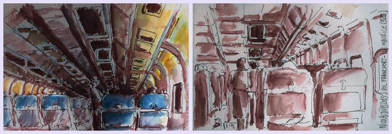 During the 11 hour’s trip, and sleeping very little, I decided to paint the interior of the Airbus A 320, also inspired by what have made the others sketchbookers like Nicholas Kern, one of my encounters in the case of my outings « Urban sketchers », or Delphine Priollaud-Stoclet (in one of her notes on her trip to New-York, for example), or the watercolourist Sonia Privat (in her excellent book « Les fées de Zanzibar »).