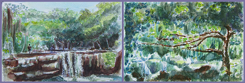 J’aurai l’occasion d’évoquer de nouveau Eurêka et son jardin dans des prochains textes illustrés de nouvelles aquarelles, mais, en attendant, je terminerai ce billet par vous présenter les cascades, situées en contrebas du domaine. Elles ne sont pas totalement naturelles et l’homme les a un peu façonnées.
