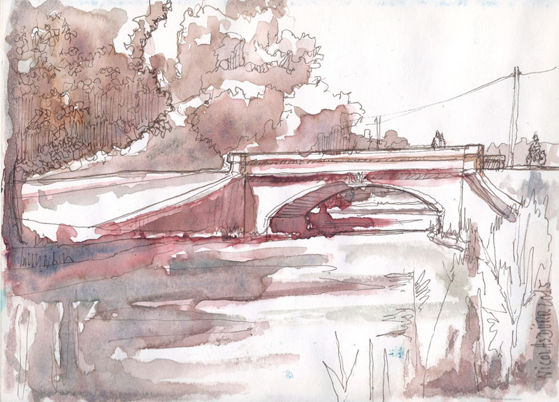 Voici maintenant le pont qui enjambe le cours d’eau. On peut se poser la question sur l’existence de cette maison de garde (du moins apparemment) à cet endroit et qui ne porte pas de plaque. La présence de bittes d’amarrage laisse supporter l’existence autrefois d’un petit port, sans doute pour permettre aux bateaux tirés par les chevaux non prioritaires de stationner en attendant de pouvoir poursuivre leur navigation. Et si c’était tout simplement une habitation d’un cultivateur ? Bien des questions se posent sur l’origine d’une habitation aujourd’hui résidentielle et relativement isolée, peut être plus pour longtemps, d’ailleurs dans le mesure ou je me suis laissé entendre dire qu’un projet immobilier pour seniors anglais fortunés était à l’étude dans ce secteur (en données 2012).