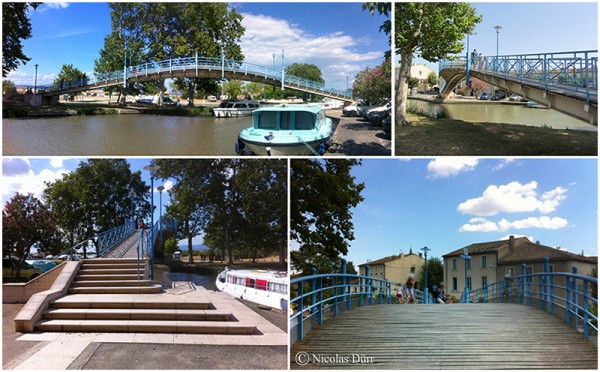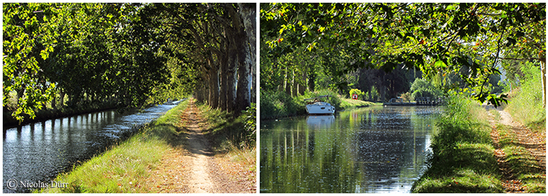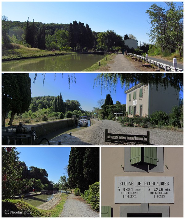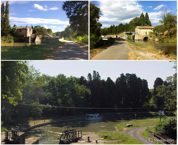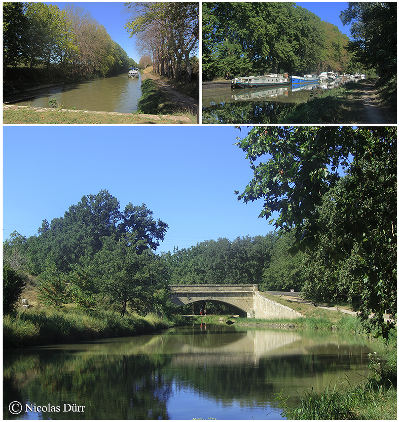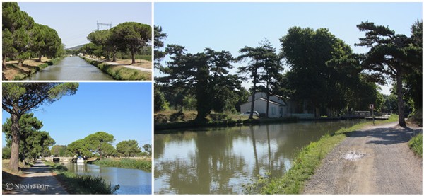 A partir du pont du chemin de fer touristique du Minervois (photo ci dessous en haut àdroite et au milieu) le Canal part en ligne droite sur un peu plus de 4 km avant d’amorcer une courbe qui passe sous le pont Neuf d’Argeliers. Le parcours agrémenté de pins parasols…