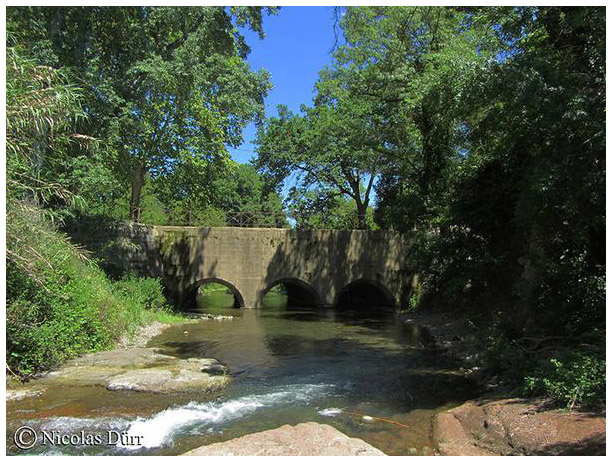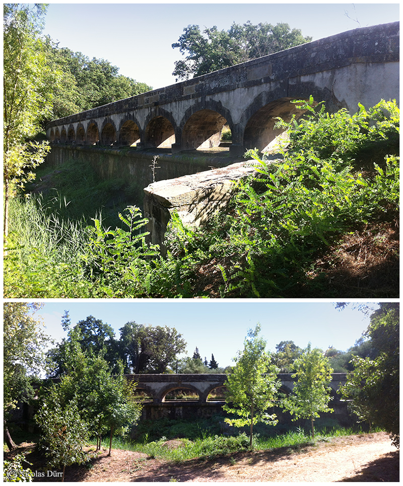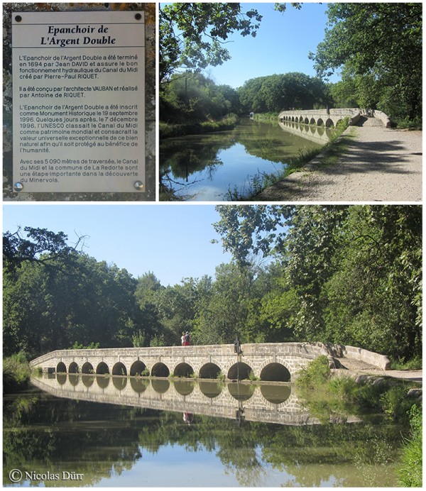 Je vous indique les ouvrages sur le trajet : le pont-Neuf d’Argeliers, 1780, le pont-Vieux, XVIIe Siècle, l’aqueduc de la Frénicoupe, 1690, départageant le Minervois, le Narbonnais,et le Biterrois, l’Hérault et l’Aude, les communes d’Ouveillan, d’Argeliers et de Cruzy, l’aqueduc de Sériège, 1689, le pont éponyme, 1780, l’aqueduc de l’Etang de Quarande, XIXe Siècle, et, enfin, le pont de Pigasse, 1684.