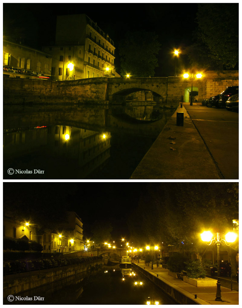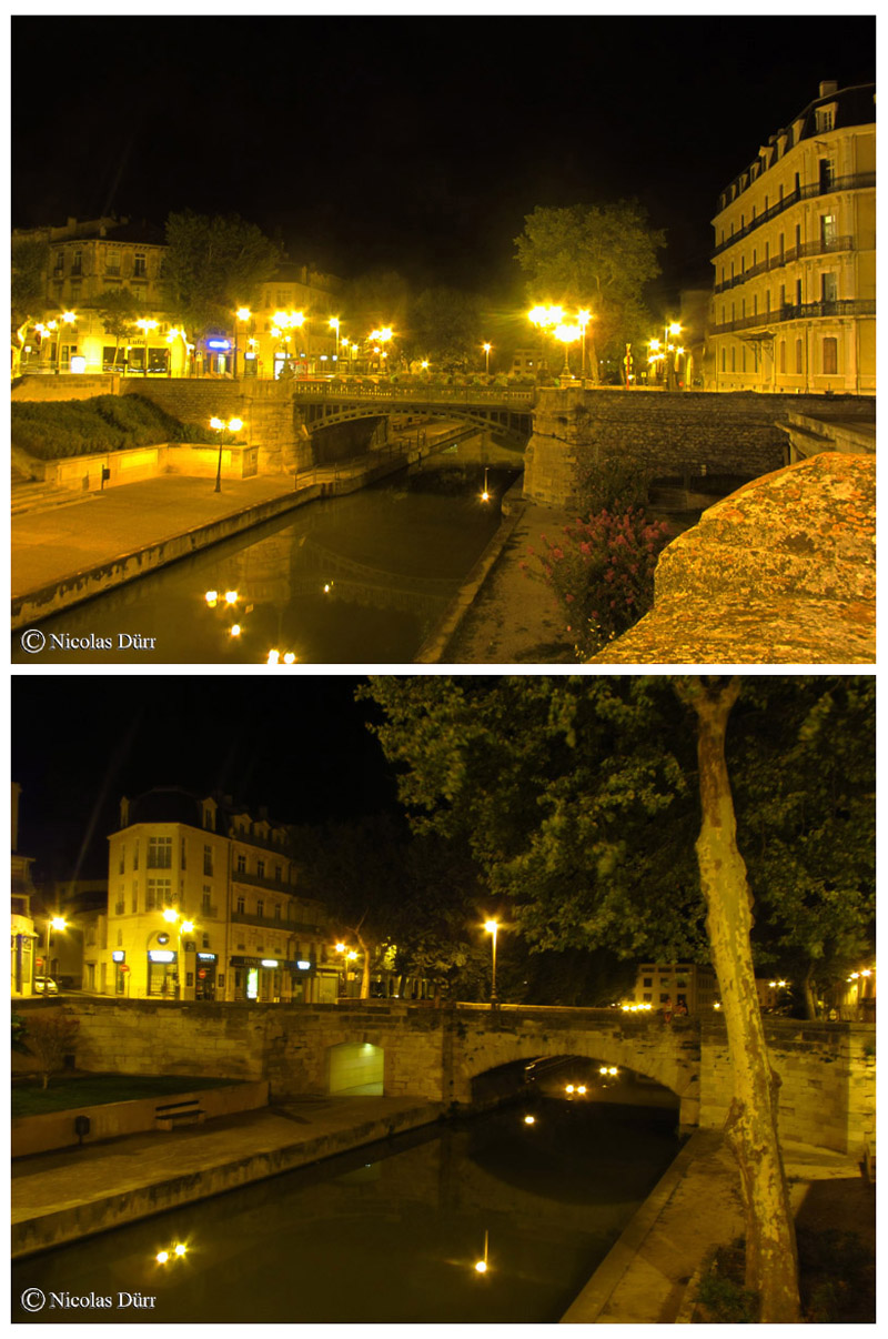 Sur la photo ci dessous en haut à gauche, l’office du Tourisme, en aval de l’écluse de Narbonne, et à droite de celle-ci, le débouché du Canal de la Robine sur les quais bordant les bâtiments cossus et éclectiques de Narbonne en aval du Pont des Marchands, et, enfin, sur la photo du bas, les façades du Pont des Marchands en aval du canal.