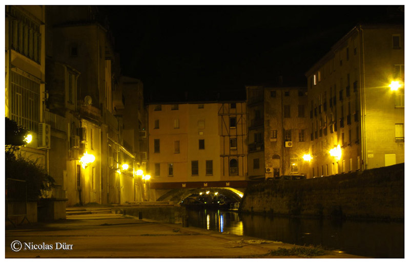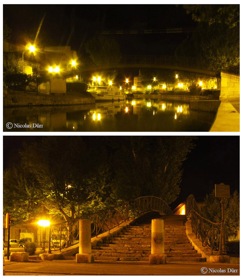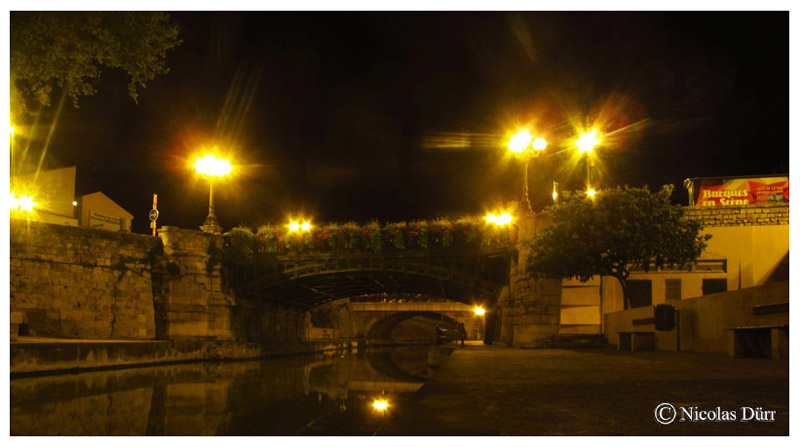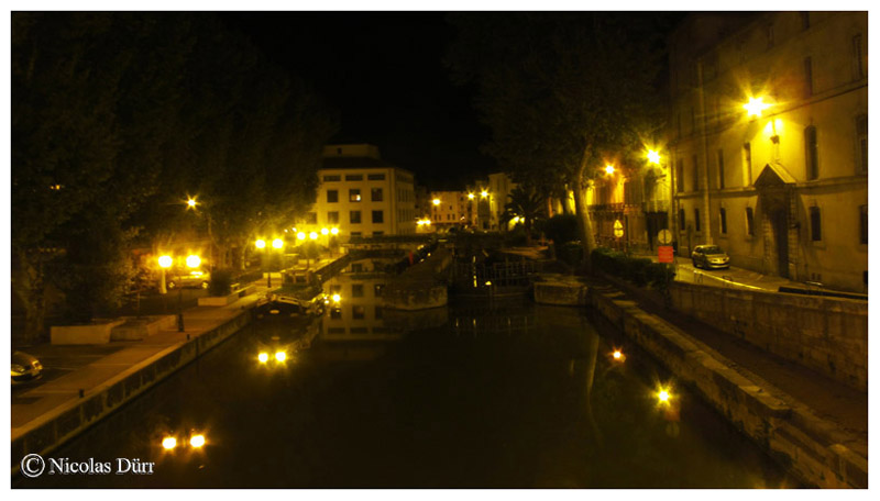 Me voici rendu maintenant sur la troisième écluse du canal, l’écluse de Narbonne, bordée d’une chaussée, et suivi de la » passerelle entre deux villes », petit clin d’œil à l’époque romaine ou le fleuve séparait la cité (Narbo Martius) au Sud, sur la rive droite du bourg, au Nord, sur la rive gauche, autrement exactement le contraire d’aujourd’hui ou le cœur de la ville se situe sur la rive gauche.