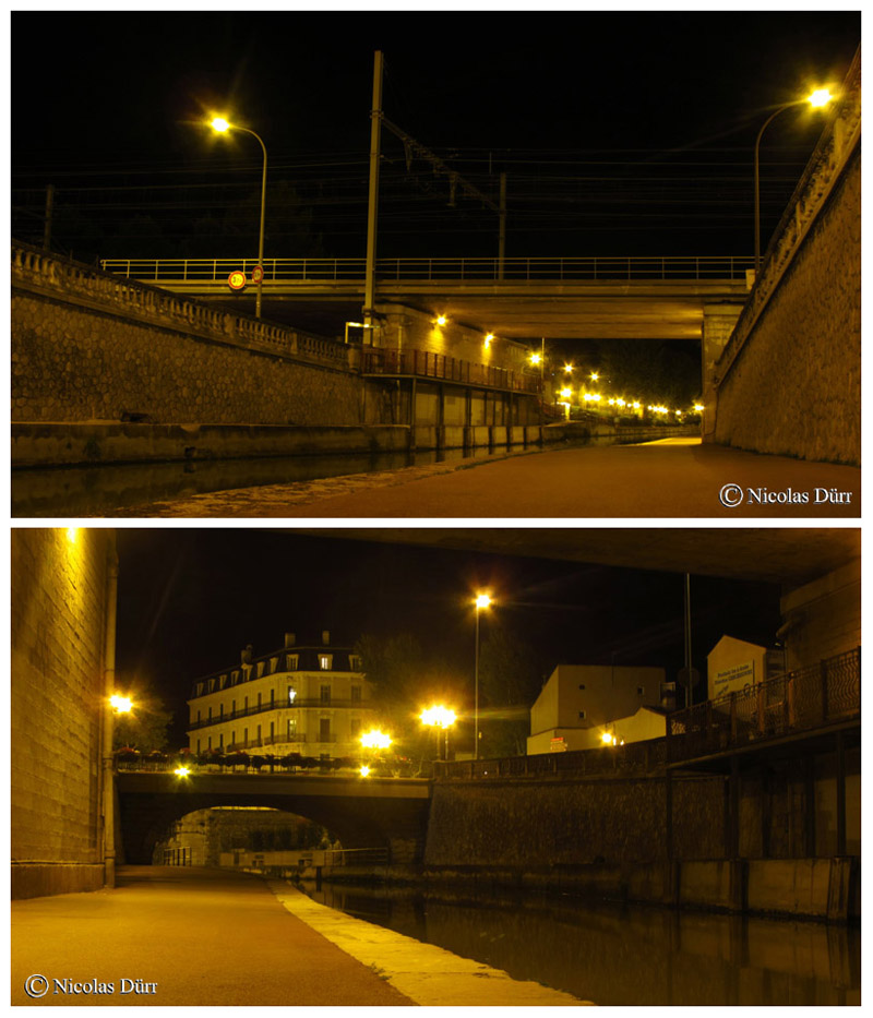 Sur la photo ci dessous en haut, passé le pont du chemin de fer sous lequel se trouvait autrefois l’écluse de la Charité (toujours indiquée d’ailleurs) , le pont de la Concorde, puis, sur la photo du bas, le pont Voltaire. Le premier s’est inscrit dans la modification du profil de la ville, et le percement de nouveaux axes de circulation suite à l’arrivée du chemin de fer et l’essor économique de la ville au 19ème siècle (architecture caractéristique alliant la pierre et le fer).