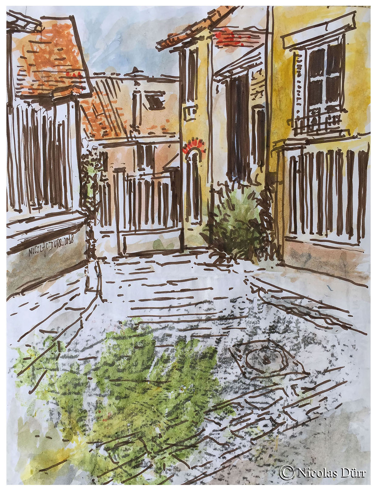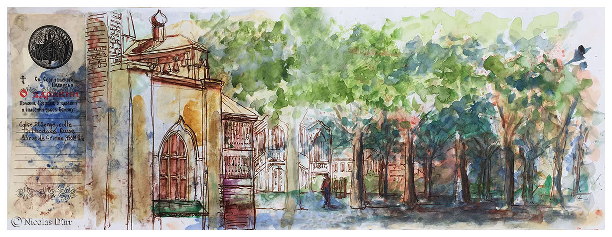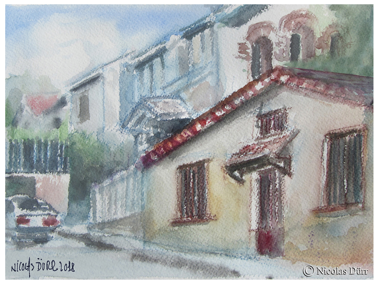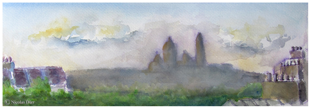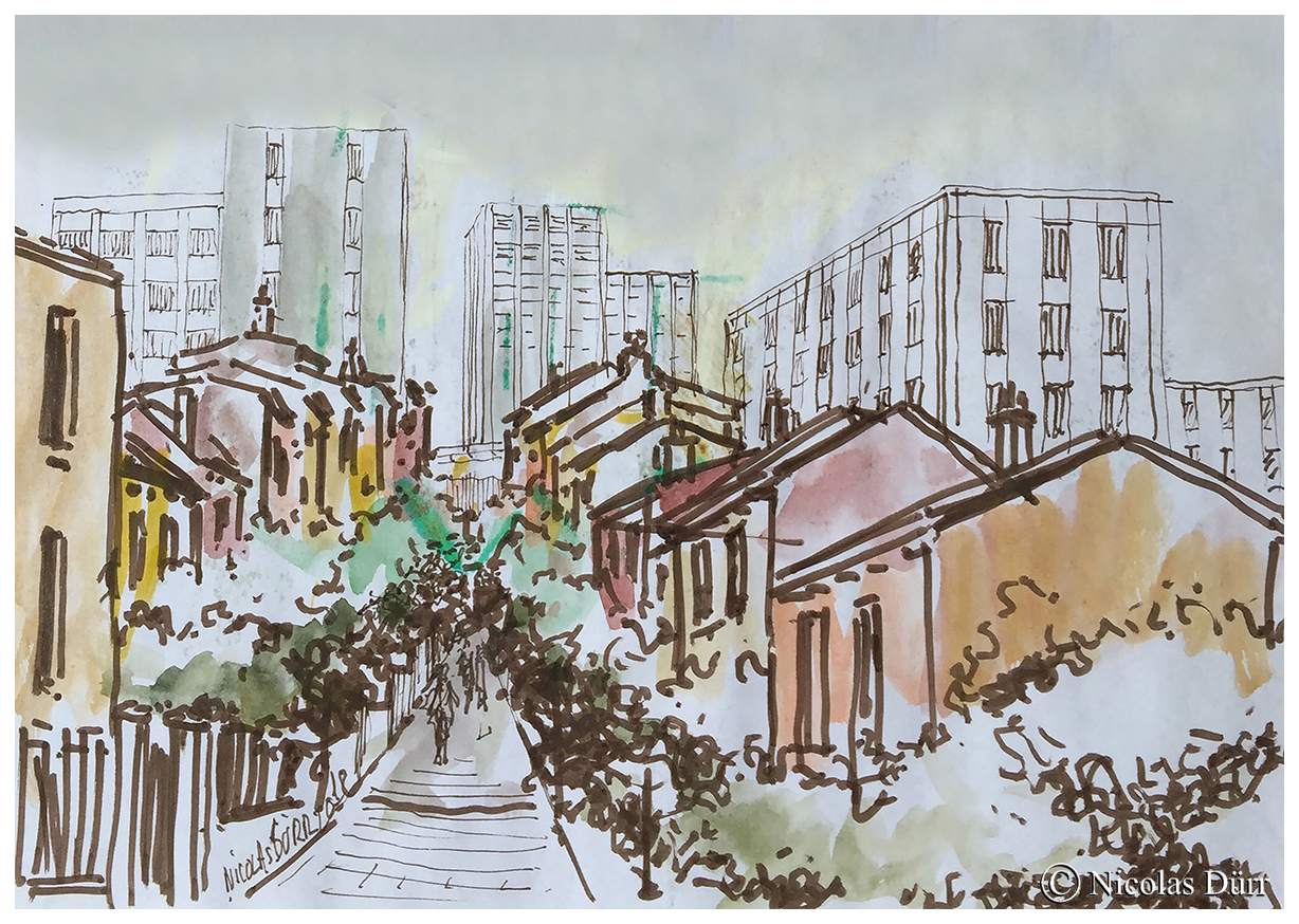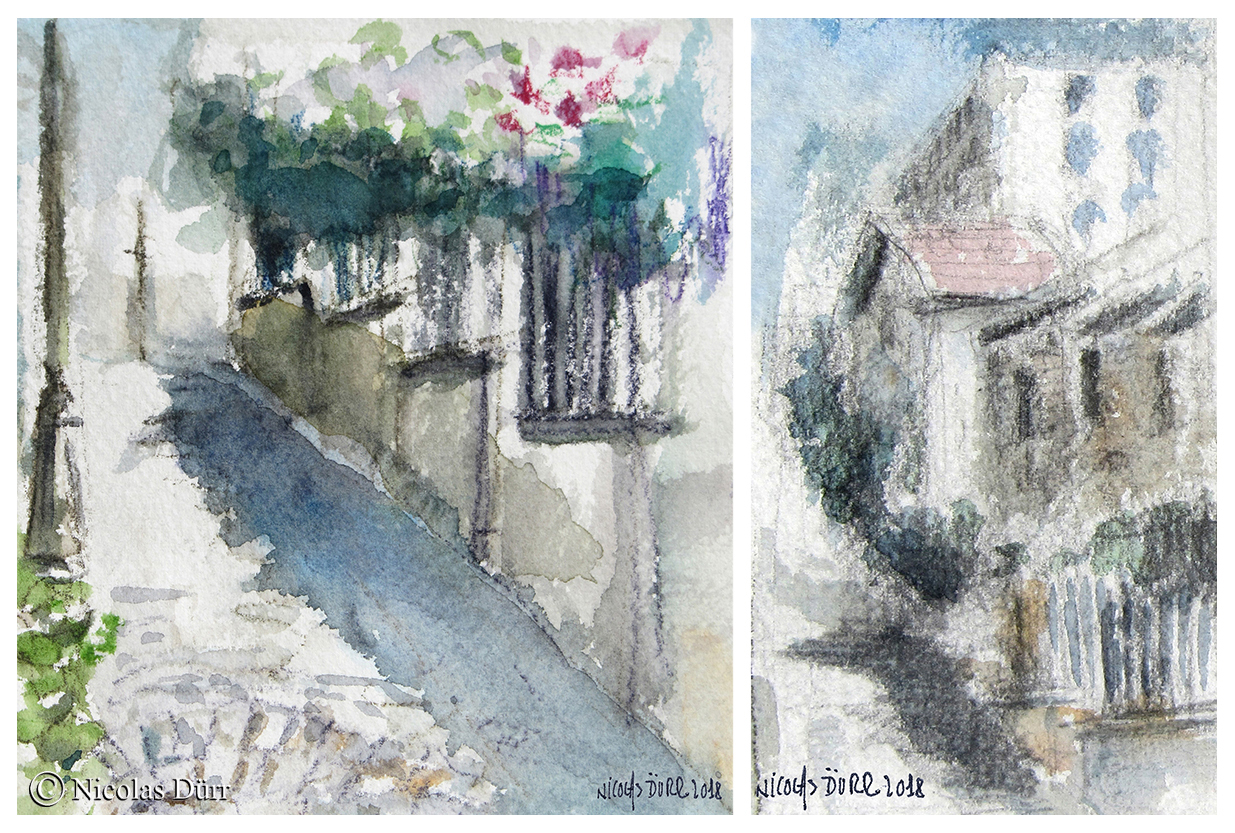 En quittant le site et en guise de « bonus », pour terminer la journée, nous nous sommes rendus à l’opposé du quartier d’Amérique, le quartier de la Butte Bergeyre. La rue Georges Lardennois aboutit sur un promontoire qui offre une vue panoramique sur le Sacré-Coeur. C’est donc par ces deux aquarelles ci-dessous que je termine ce récit.