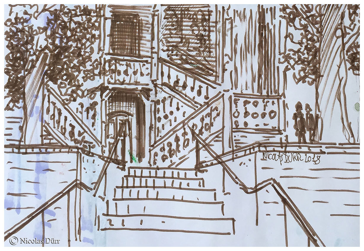 Ce samedi 14 avril 2018, je suis parti retrouver Cécile Alma-Filliette, aquarelliste,qui organisait une sortie dans ce qu’elle définit comme un des endroits du « Paris insolite », le quartier autour de la place Rhin et Danube, dans le 19e arrondissement de Paris. Autrefois, en lieu et place du quartier, se situaient ici des carrières de pierres qui on servies à l’édification des immeubles au centre de la capitale.