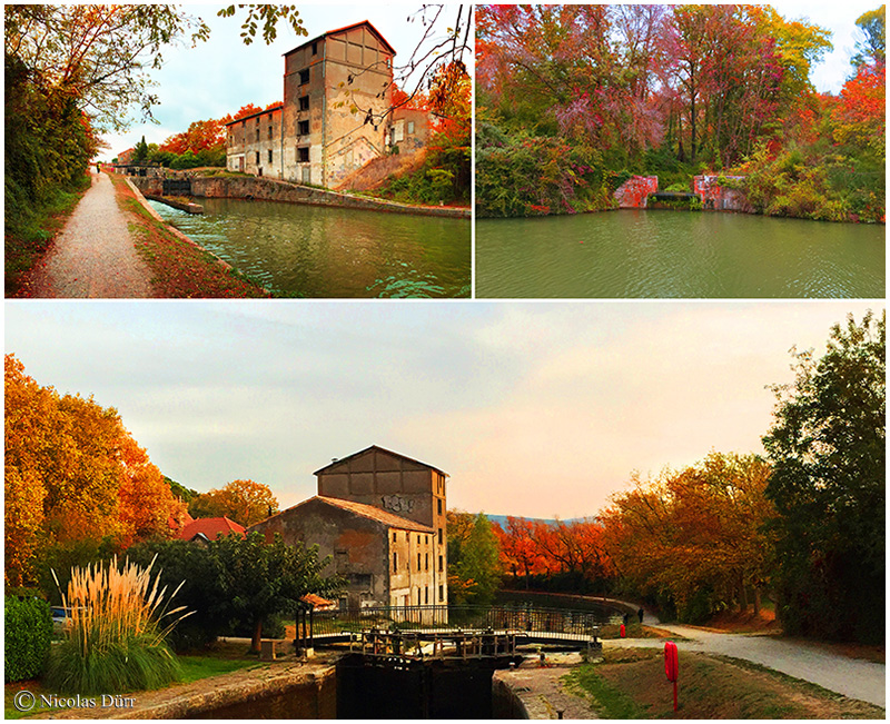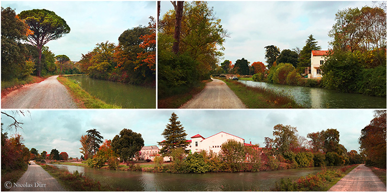 Sur la photo ci dessous, sur la rive droite du Canal du Midi, au premier plan, nous nous trouvons sur la commune d’Ouveillan, en Narbonnais, dans le département de l’Aude. Sur la rive gauche, après avoir traversé le pont et ou se trouve le bâtiment, nous sommes sur la commune d’Argeliers, en Minervois, toujours dans le département de l’Aude. La colline au fond se trouve sur la commune de Montouliers, dans le Biterrois et le département de l’Hérault.