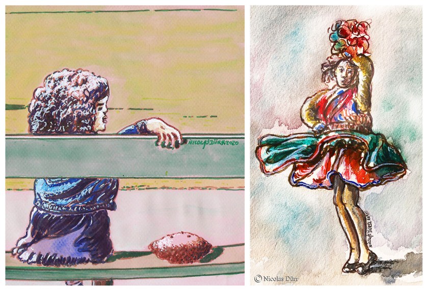 Cependant, j’ai tout d’abord relevé le défi que m’avait lancé Jean-François, un de mes amis, qui m’avait envoyé la photo d’une petite fille au nounours assise sur un banc. J’en ai donc fait une version sur papier couleur, en techniques mixtes, feutre, crayons de couleur et aquarelle. Que peut donc regarder cette petite !!!??? Pourquoi ne serait t’elle pas captée par cette danseuse sud-américaine que j’ai peinte ensuite en suivant une visioconférence d’Alain !!!???