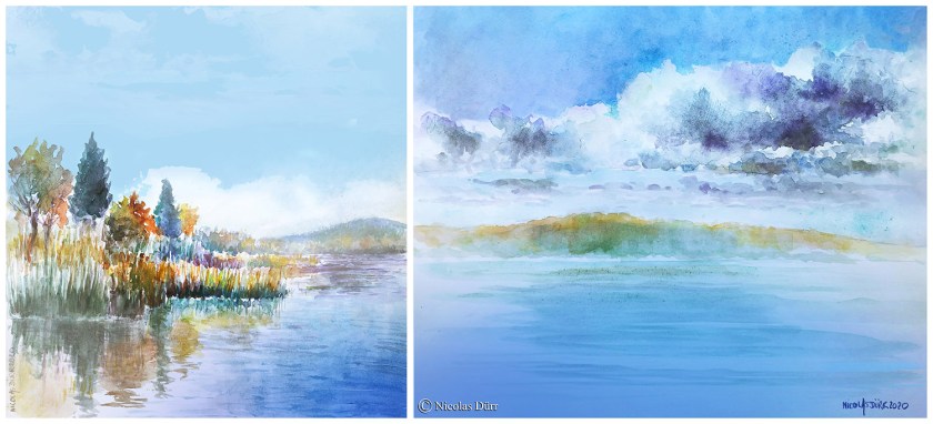 Et pour poursuivre sur les visioconférences (ou télé-ateliers), ci dessous, deux aquarelles du Québec en automne, au lac Brome, dans la réserve naturelle Quilliams-Durrull.