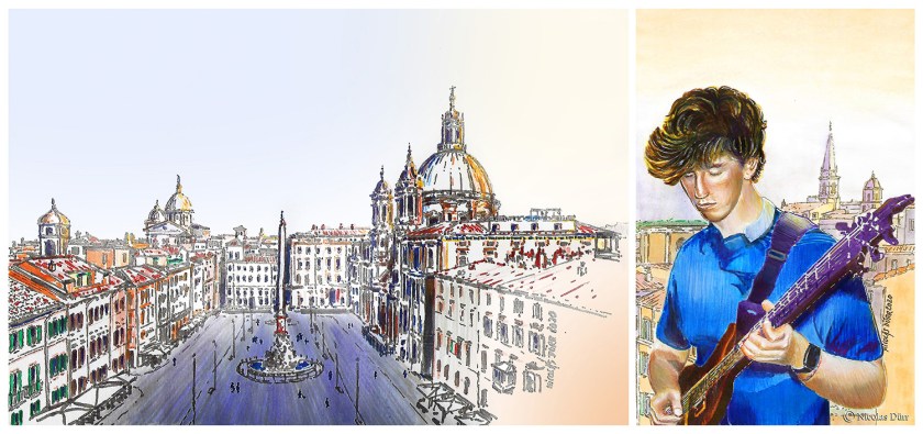 Direction Rome, cette fois, et particulièrement une terrasse de la Place Navone d’ou a joué de la guitare électrique tous les soirs à 19h30 pendant la durée du confinement en Italie, le jeune Jacopo Mastrangelo, 19 ans (sujet d’une de mes publications). C’est d’après un reportage au journal télévisé à ce sujet que j’ai eu envie de travailler sur ces visuels, qui ont été, je le précise au passage, appréciés par l’intéressé sur les réseaux sociaux.