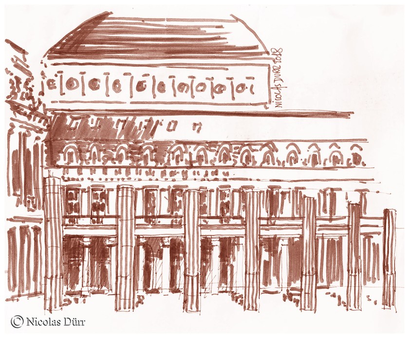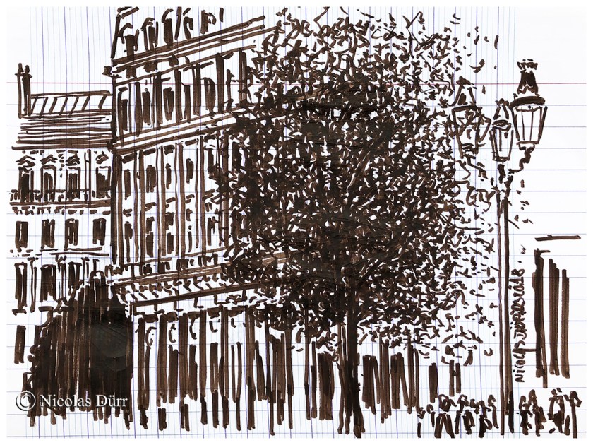 Dans le cadre de mes promenades graphiques parisiennes et d’une sortie proposée par Delphine Priollaud-Stoclet, je vous emmène à travers cet article, place du Palais Royal, et pour commencer, par son accès par la place Colette, sur laquelle vient se terminer l’avenue de l’Opéra (une « mise en place rapide sur un cahier scolaire, puis une étude sur carnet).