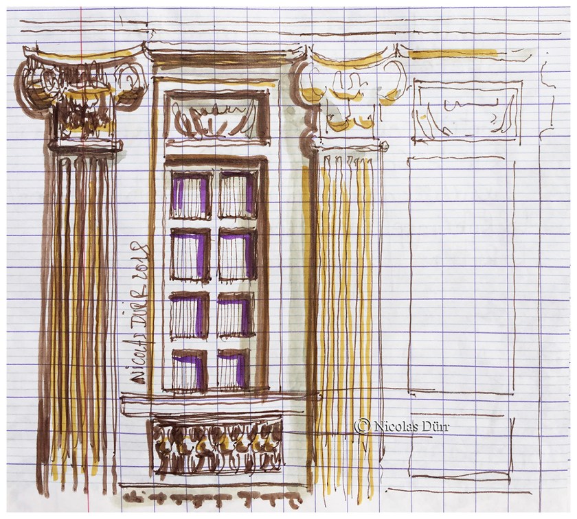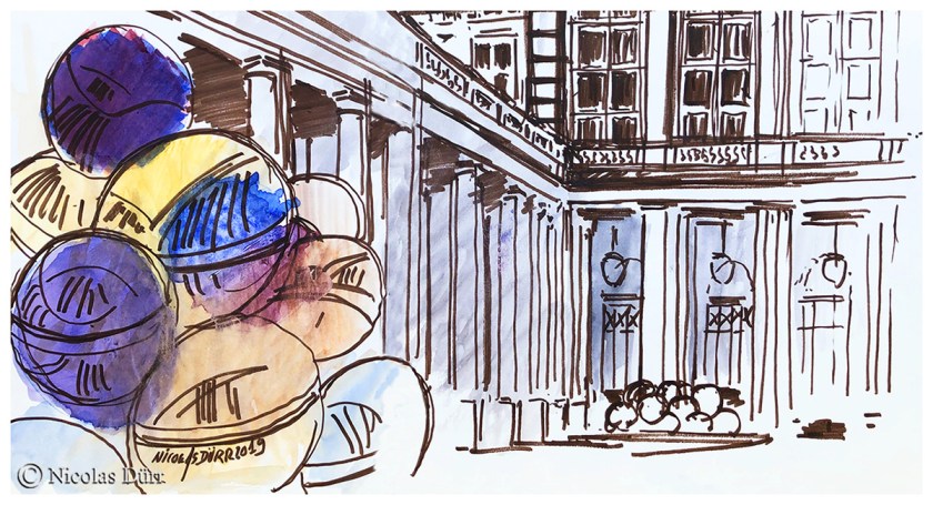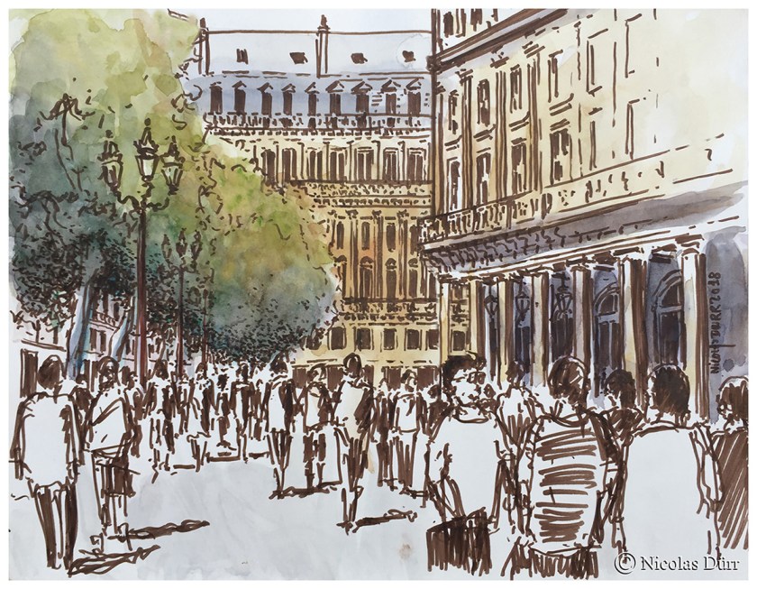 Dessins et aquarelles de Nicolas globe croqueur sur une des places architecturalement remarquables de Paris.