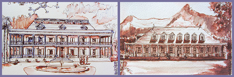 Sur le travail à la plume ci dessous à droite, une autre propriété au milieu d’une nature luxuriante, Eurêka. On le doit à l’un des anciens propriétaires qui a eu la bonne idée d’acheter les terrains environnants, de manière à nous éloigner d’espaces urbanisés ou en voie d’urbanisation. Ici, on est hors du temps. La propriété se visite, mais on peut aussi y déjeuner, ou boire simplement un verre accompagné de « mise en bouche », assis confortablement sur des fauteuil en osier (ci dessous, dessin à la plume et encre diluée). Une Portlouisienne, Rosemonde, qui m’accompagnait, m’a d’ailleurs fait la remarque suivante : « ici, on est dans une vraie maison ».