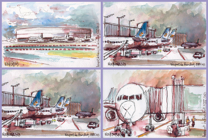 After having presented to you in a previous post, in august 2013, an introduction to my account of the trip to Mauritius, I now enter in the very heart of the subject by presenting to you my watercolours enhanced first with pen of the Roissy Charles De Gaulle and Frankfurt terminals, the way which I have chosen to go to the other side of the world. The long waitings, downside for lower transportation costs, allowed me to get out my paintbrushes and pots.