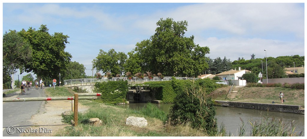 Direction maintenant le pont des trois yeux et l’écluse ronde d’Agde.